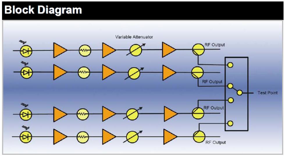 The GSOR-RRX-04 is a CATV Return Path Receiver Module with four optical inputs. The module is implemented by a low noise PIN diode and a high output level RF amplifier. The module features four independent RF out-put ports, which are located on the rear panel of the receiver module, providing up to 45dBmV output level. Monitoring and configuration setting of the receiver module are all achieved via the front panel and GSOR-EMS equipment management module.